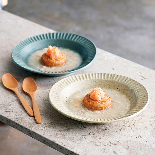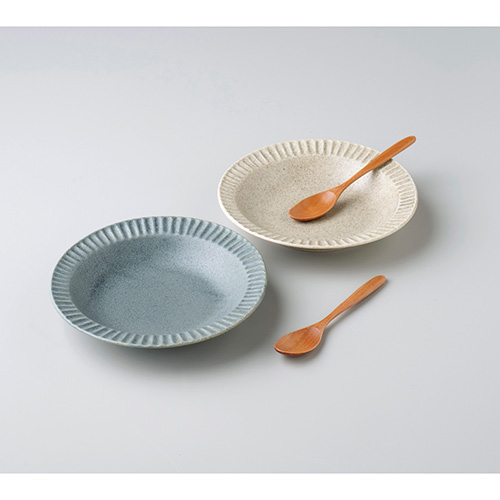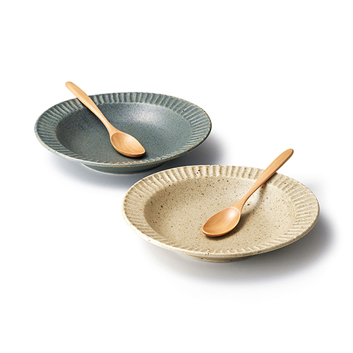素朴な風合いとやさしいぬくもりが魅力のプレートセット。 うつわに施されたソギ模様がアクセントとなり、シンプルながらも飽きのこないデザインに仕上がっています。 程よい深さがあるため、汁気のある料理にも対応でき、盛り付けの自由度も高く、和洋問わず幅広いメニューに活躍します。 天然木のスプーンは手になじみやすく、ウレタン塗装で扱いやすさも兼ね備えています。電子レンジ対応の磁器製プレートは、温めてそのまま食卓に出せる手軽さも嬉しいポイント。 毎日の食事に寄り添いながら、心地よい時間を演出してくれるセットです。