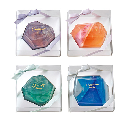 ソープ アメジスト(約タテ9×ヨコ9×高さ4cm)×1、ソープ ローズクォーツ(約タテ9×ヨコ9×高さ4cm)×1、ソープ エメラルド(約タテ9×ヨコ9×高さ4cm)×1、ソープ サファイア(約タテ9×ヨコ9×高さ4cm)×1