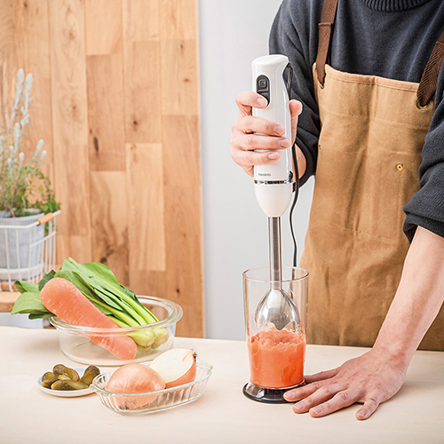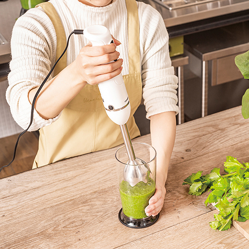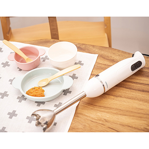 つぶす・ねる・まぜるの1台3役で、日々の調理をやさしくサポートするハンディーブレンダー。 離乳食やポタージュ、魚のつみれやマヨネーズ、手作りドレッシングまで、幅広いメニューに活躍します。 2段階のスピード切替機能付きで、食材や用途に合わせた使い分けが可能。加熱後の鍋やボウルにそのまま使えるので、下ごしらえもスムーズに仕上がります。 ブレンダー部分はステンレス製で、色やニオイが移りにくく衛生的。 さらに、目盛り付き専用カップ、専用カップでの保存に便利なフタも付いているので、作った料理をそのまま保管できるのもうれしいポイントです。