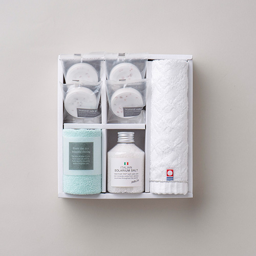 地中海の風を感じるイタリアの天日塩を、バスソルトにしてボトルに詰め込みました。 お湯に溶かすたび、旅先のバスルームでくつろぐような、心ほどけるひとときを。 さらに、やさしい肌ざわりの今治ウォッシュタオルとマイクロファイバークロス、発砲タイプの入浴料「ソルト・フィズ」もセットに。 ちょっと贅沢なバスタイムをお楽しみいただけます。