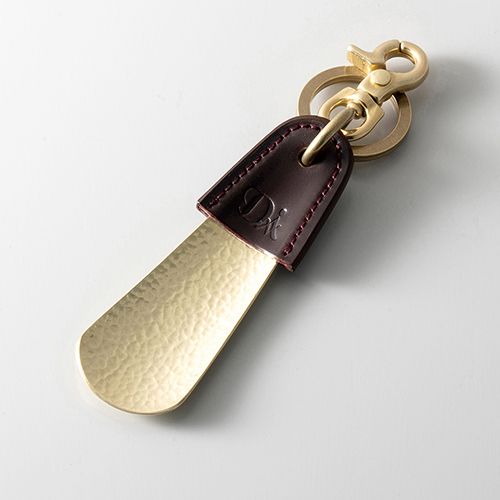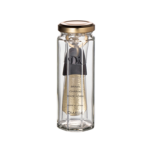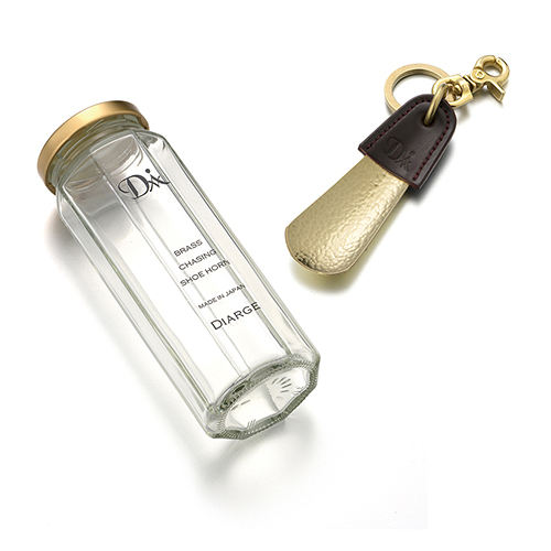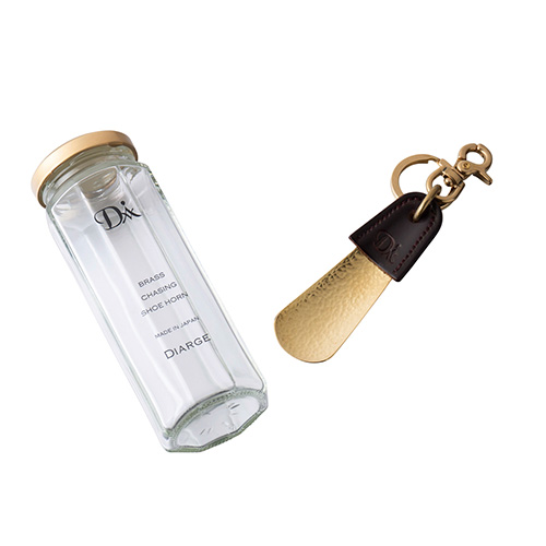 ガラスの小瓶に収められた、ディアージのキーリング付きシューホーンセット。職人が丁寧に打ち出した真鍮製の靴べらは、紳士の嗜みとしての品格を備えています。コードバンレザーには、さりげなくロゴ刻印が施され、洗練された印象を添えます。 東京都台東区を拠点に、地場の職人による手仕事にこだわるディアージが手がけたこのセットは、使い込むほど味わいを深める真鍮金具と、経年変化を楽しめるレザーの風合いが、日々の所作に静かな美しさをもたらします。