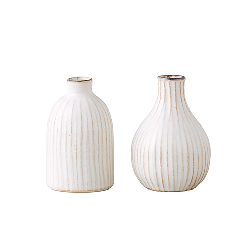 栃木県益子町の豊かな自然に囲まれた工房で、一つひとつ丁寧に手作りされた益子焼の一輪挿し。 ターニップとガーリックの2種がセットになっており、並べるだけでテーブルや窓辺にさりげない表情を添えます。素朴で温かみのあるデザインは、庭先で摘んだ小花やグリーンを自然に引き立て、日常のちょっとしたひとときをやさしく彩ります。 手作りならではの微妙な色合いや形の違いも味わいのひとつ。長く使うほどに暮らしに馴染み、自然のぬくもりを感じられます。