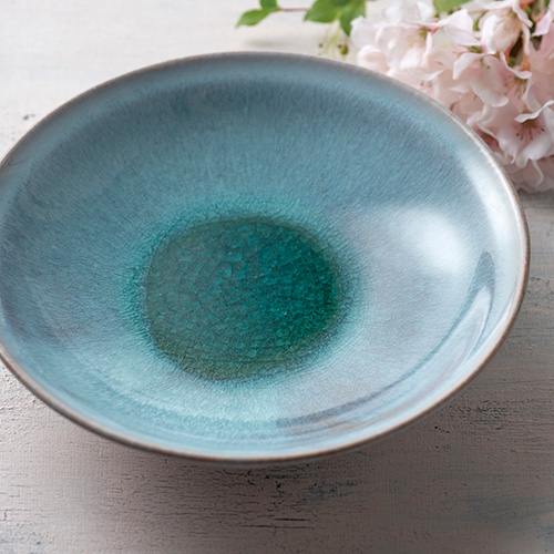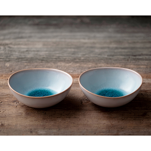 たわみのある愛らしいフォルムが特徴のペア鉢。 取り皿やデザート皿としても使いやすいサイズ感で、普段使いはもちろん、おもてなしの席にもふさわしい上品な佇まいです。 釉薬の上にガラス釉を重ねることで、溶けたガラスが中央に溜まり、冷める過程で細かな貫入が生まれきらきらと輝き、料理を美しく引き立てます。 萩焼のうつわは、ふっくらとした質感が持ち味。原料に用いられる陶土と、それに混ざる釉薬の具合によって表面に細かなヒビが生じます。使い込むにつれてお茶などの色味のあるものが染み込み、 徐々に色合いが変化していく「七化け」を楽しむことができます。