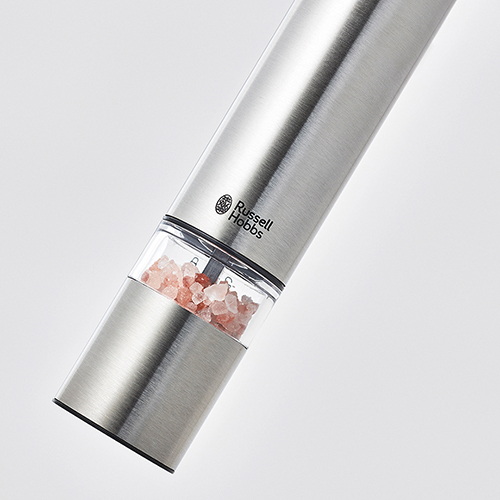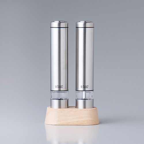 1955年に革新的な電気ケトルを発表して以来、世界中で高く評価されてきたイギリスの家電ブランド「ラッセルホブス」が手がける電動ミル ミニの2本セット。 片手で使えるワンプッシュ式のコンパクトなミルは、透明キャビンで残量がひと目でわかり、広めの充填口で補充も簡単。サビに強く岩塩にも対応するセラミック刃を採用し、底部のツマミで挽き加減の調整も可能です。 また、おしゃれな木目調の専用スタンド付きで、すっきりと収納できます。 料理の仕上げや食卓でのひと足しに、スマートに活躍するアイテムです。