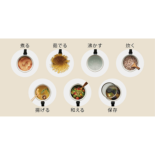 煮る・茹でる・沸かす・炊く・揚げる・和える・保存まで、1台で7役こなすマルチポット。 ホーローの表面はガラス質のため、汚れやにおいが移りにくく、お手入れも簡単。揚げ物やジャム作りはもちろん、和食の煮物やお出汁をとる調理にも気兼ねなく使えます。 腐食にも強く、余った味噌汁や煮物もそのまま冷蔵庫で保存でき、作り置きにもぴったり。高さを抑えたコンパクトな設計と扱いやすいハンドルで、冷蔵庫にもすっきり収まります。