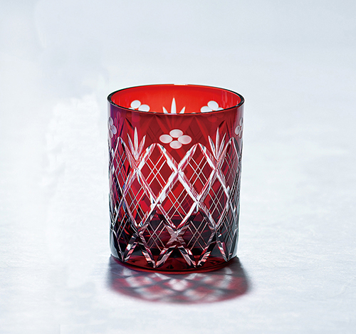 江戸切子 小花剣矢来紋 ロックグラス(赤)